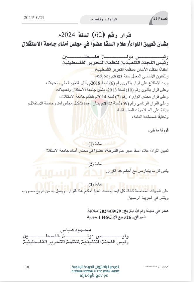 كما أصدر الرئيس مرسوماً بتعيين اللواء علام السقا مدير عام الشرطة، عضواً في مجلس أمناء جامعة الاستقلال.