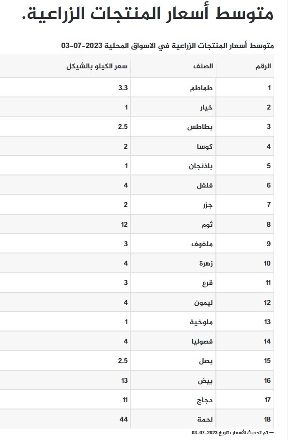 جاءت قائمة أسعار الخضروات والدجاج والبيض واللحوم في أسواق غزة اليوم الإثنين 3 يوليو 2023،عالنحو الاتى :