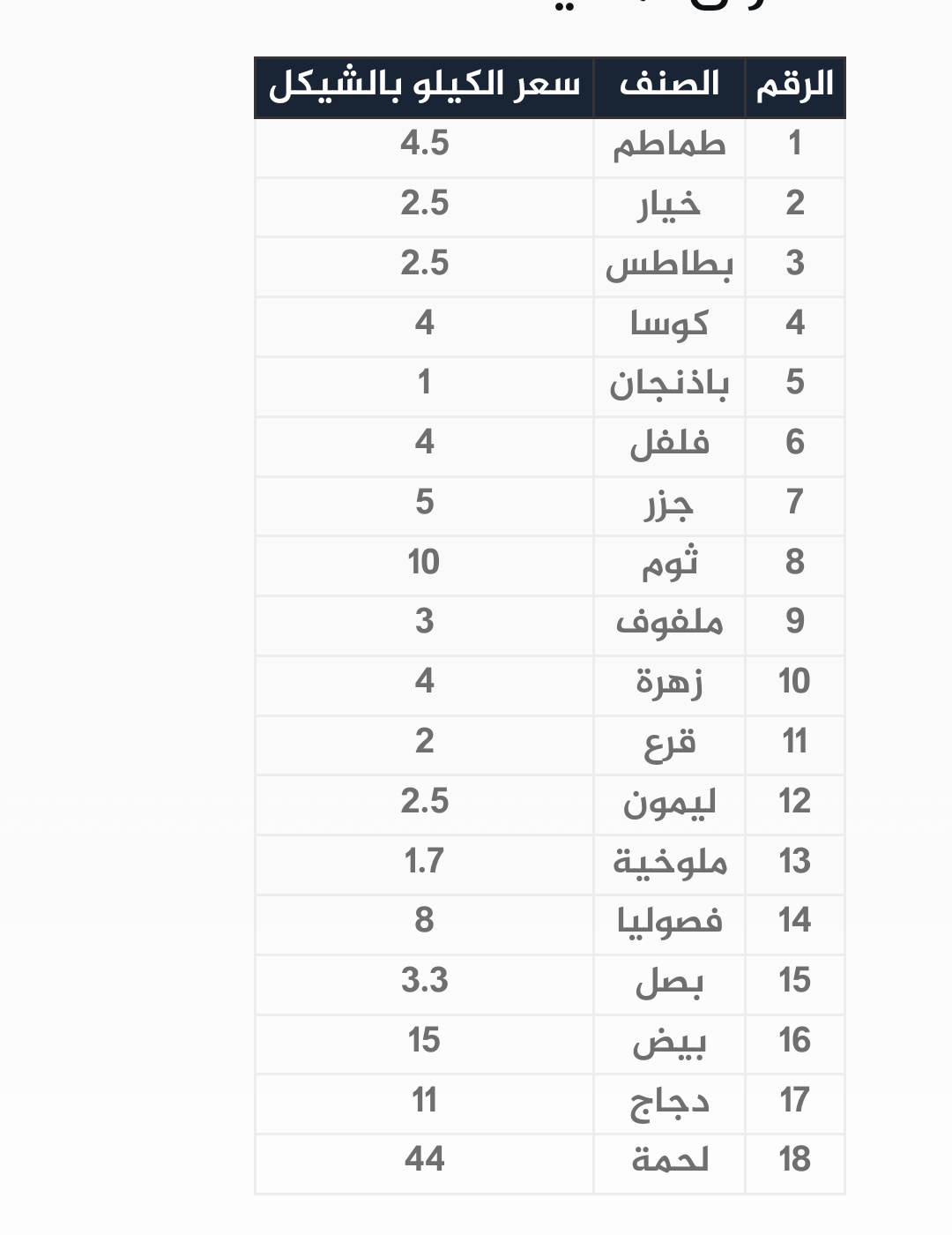 جاءت قائمة أسعار الخضروات والدجاج واللحوم في أسواق غزة اليوم الثلاثاء 12 سبتمبر 2023، عالنحو الآتي: