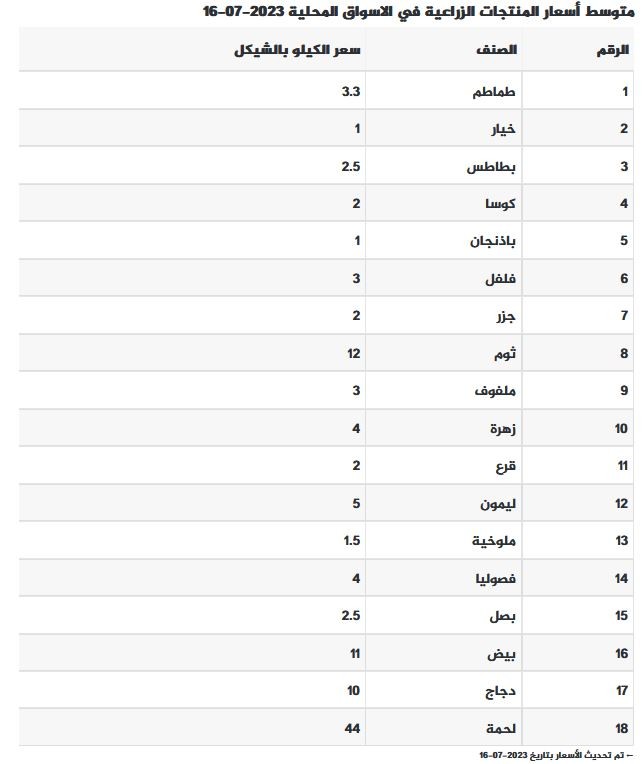 جاءت قائمة أسعار الخضروات والدجاج والبيض واللحوم في أسواق غزة اليوم الأحد 16 يوليو 2023 عالنحو الآتي: