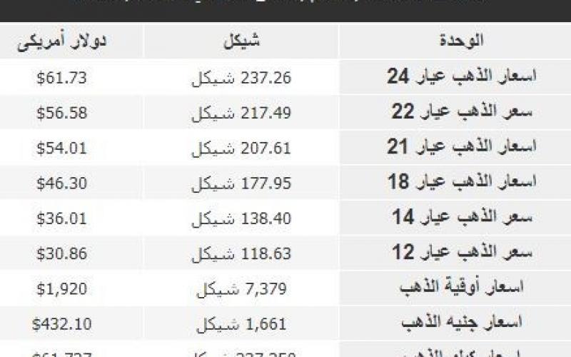 سجلت أسعار الذهب في أسواق فلسطين، اليوم الأحد، وفقًا للشيكل الإسرائيلي