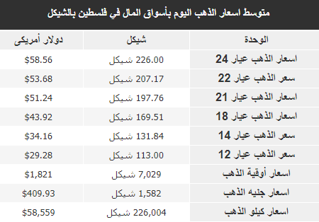 سُجلت أسعار الذهب في أسواق فلسطين، اليوم الجمعة، وفقًا للشيكل الإسرائيلي والدولار، على النحو التالي: