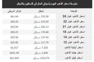 سُجلت أسعار الذهب في أسواق فلسطين، اليوم الجمعة، وفقًا للشيكل الإسرائيلي والدولار، على النحو التالي:
