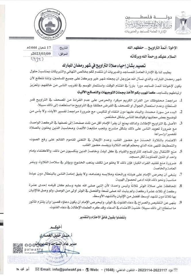 أعلنت وزارة الأوقاف بغزة اليوم الأربعاء 15 مارس 2023، سلسلة من التوجيهات لأئمة المساجد، بخصوص صلاة التراويح بالتزامن من اقتراب شهر رمضان 2023.
