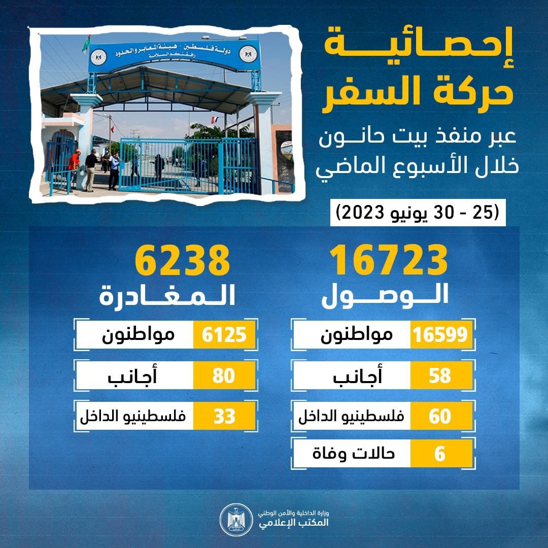 إحصائية حركة التنقل عبر منفذ بيت حانون خلال الأسبوع الماضي (25 – 30 يونيو 2023)
