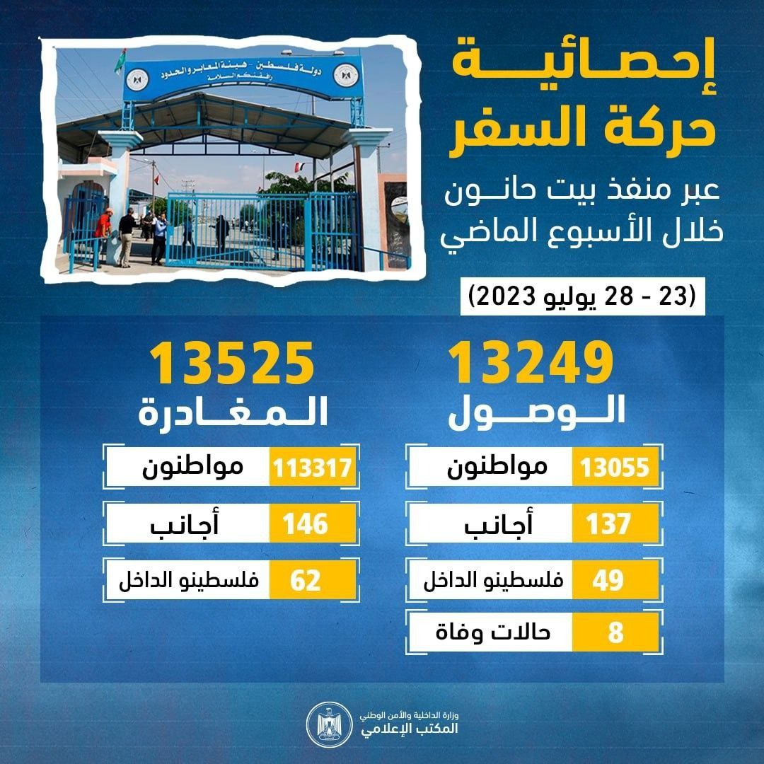 إحصائية حركة التنقل عبر منفذ بيت حانون خلال الأسبوع الماضي (23 – 28 يوليو 2023)