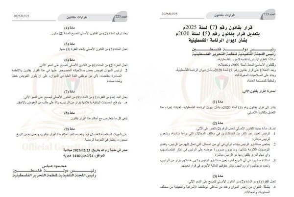 إدخال تعديدلات جديدة على قرار بقانون بشأن ديوان الرئاسة الفلسطينية