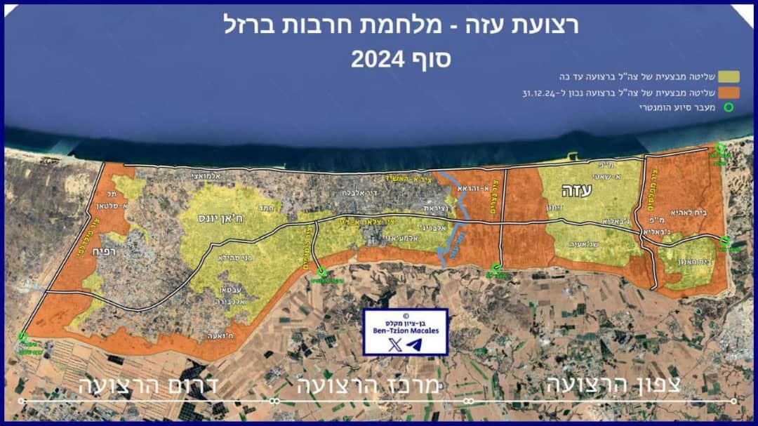 نرفق لكم خريطة نشرها الإعلام العبري لمناطق يسيطر عليها جيش الاحتلال الإسرائيلي في قطاع غزة مع بداية عام ٢٠٢٥.