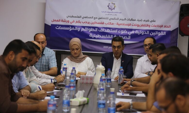 ودعا الإعلاميون والحقوقيون خلال ورشة عمل نظمها اتحاد الإذاعات والتلفزيونات الإسلامية- مكتب فلسطين- عشية إحياء فعاليات اليوم العالمي للتضامن مع الصحافي الفلسطيني، بعنوان: “القوانين الدولية في ضوء استهداف الطواقم والمؤسسات الصحفية الفلسطينية”، المؤسسات الحقوقية والصحفية الدولية إلى ضرورة التدخل الفوري والعاجل لوقف الانتهاكات الإسرائيلية بحق الصحفيين الفلسطينيين في قطاع غزة، والضفة والقدس المحتلتين، بما يكفل لهم حرية العمل الصحفي التي أقرتها التشريعات والقوانين الدولية.