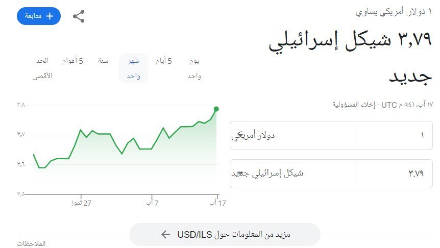 ارتفاع جديد للدولار الآن مقابل الشيكل، حيث وصل سعر صرف الدولار الآن مقابل الشيكل الإسرائيلي، مساء اليوم الخميس 17 أغسطس 2023، عند 3.79 شيكل.