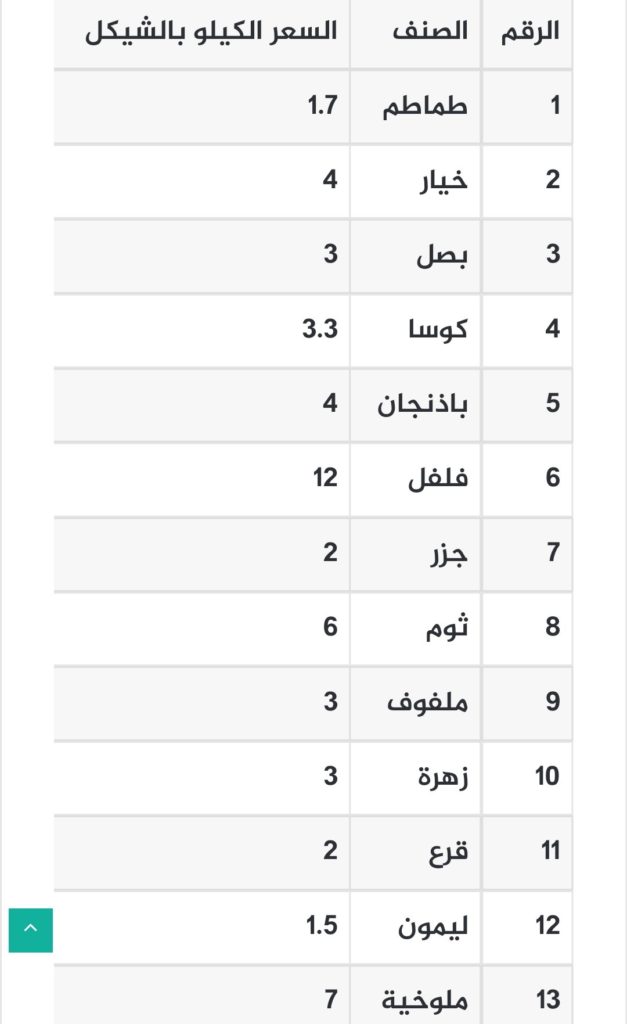 جاءت أسعار الخضروات والدجاج واللحوم في أسواق قطاع غزة،اليوم الاثنين 20 فبراير 2023،عالنحو الآتي: