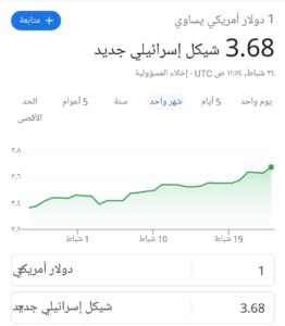 وبلغ سعر صرف الدولار الأمريكي 3.68 شيكلاً بعد أن تم تداوله في الصباح ب 3.63 شيكلاً.