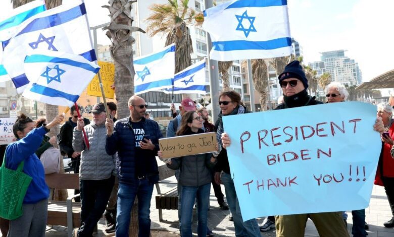 تظاهرة خارج السفارة الأميركية في تل أبيب احتفاءً بالانتقادات التي وجهها بايدن على خطة حكومة نتنياهو لإضعاف القضاء (Getty Images)
