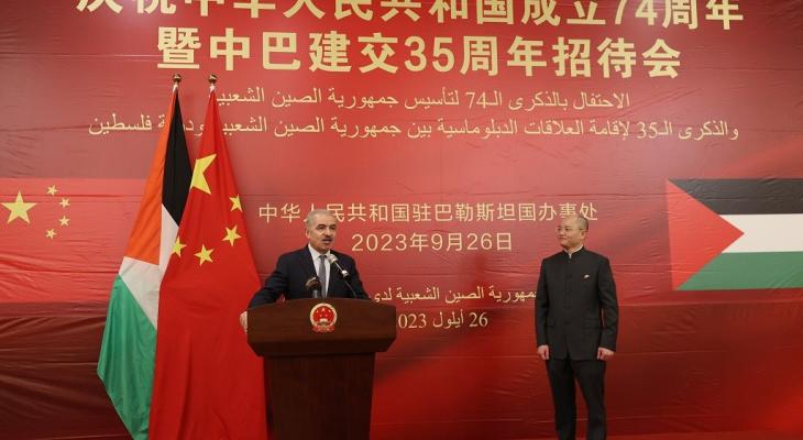 وأضاف اشتية: “باسم السيد الرئيس محمود عباس والحكومة وشعبنا والحاضرين، نتقدم لجمهورية الصين الشعبية قيادة وحكومة وشعبًا، بالتهنئة في هذا اليوم المتميز الذي تحتفل فيه الصين باليوم الوطني، ذكرى ثورة أكتوبر، 74 عاما على تأسيس جمهورية الصين الشعبية”.