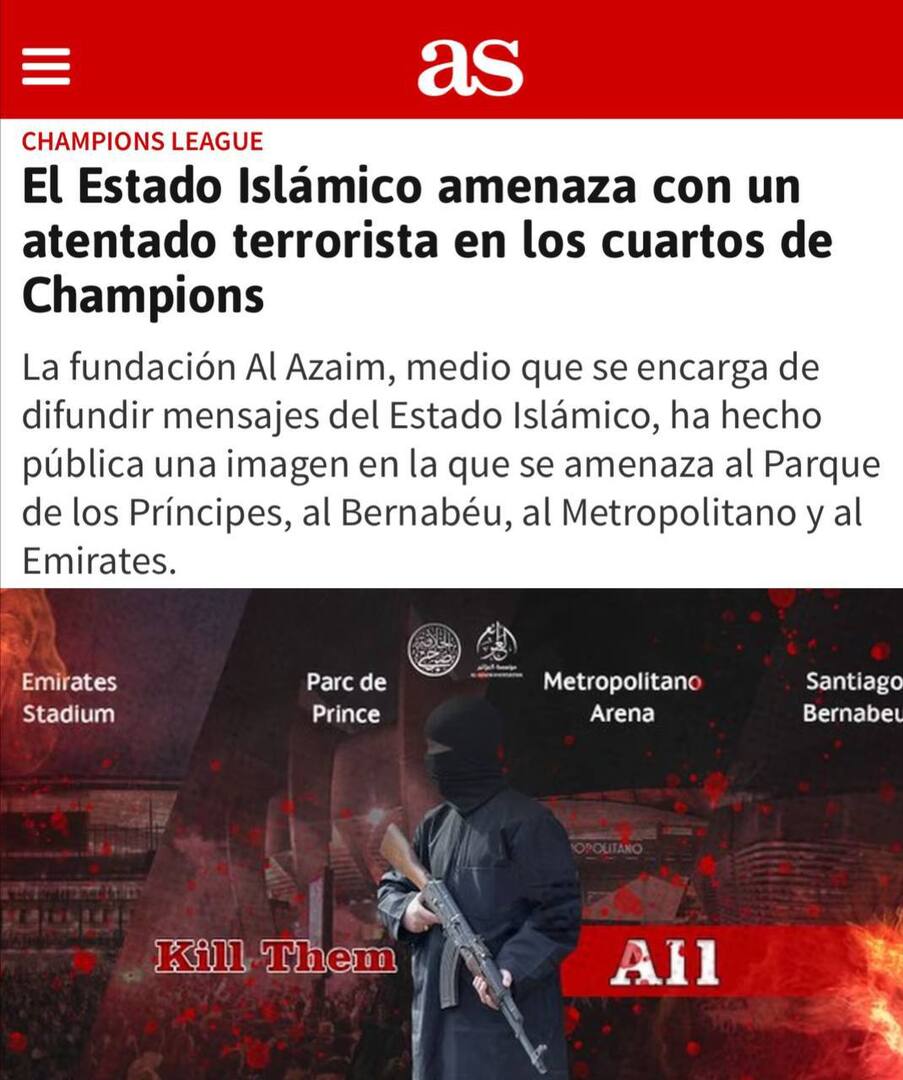 وبحسب صحيفتي Diario AS و Marca فقد نشر الإرهابيون صورة لرجل مسلح وأسماء أربعة ملاعب ستقام فيها المباريات هذا الأسبوع، مع تعليق “اقتلوهم جميعا”.
