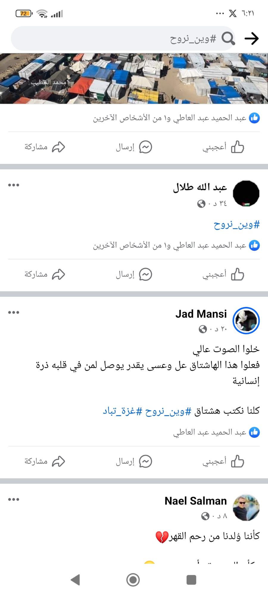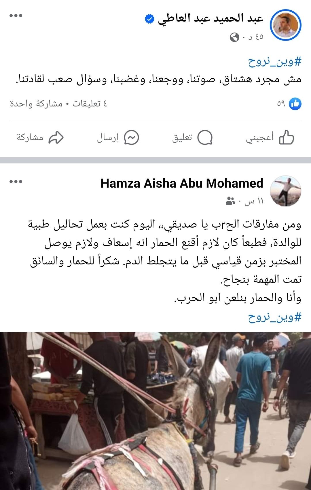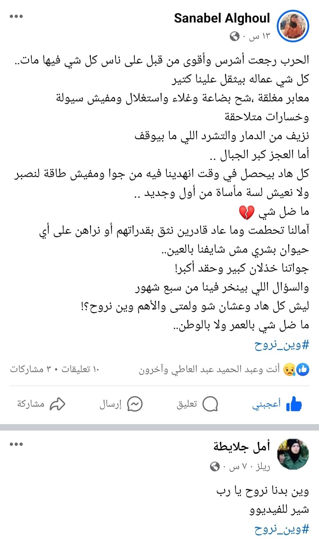 وكتب الإعلامي عبد الحميد عبد العاطي عبر حسابه الشخصي على فيسبوك: “اطلاق هشتاق #وين_نروح رسالة للعالم لقادتنا، اكتب عن نزوحك عن معاناتك”.