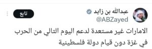 أكد وزير خارجية الامارات العربية المتحدة عبد الله بن زايد، مساء اليوم السبت، أن دولته لن تشارك في أي خطة لليور التالي بعد انتهاء الحرب على القطاع دون سلطة فلسطينية.
