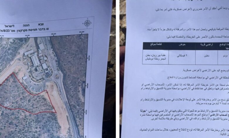 أصدرت قوات الاحتلال الإسرائيلي، اليوم الثلاثاء، أمرا بوضع اليد على أراضي المواطنين في بلدة نعلين غرب رام الله.