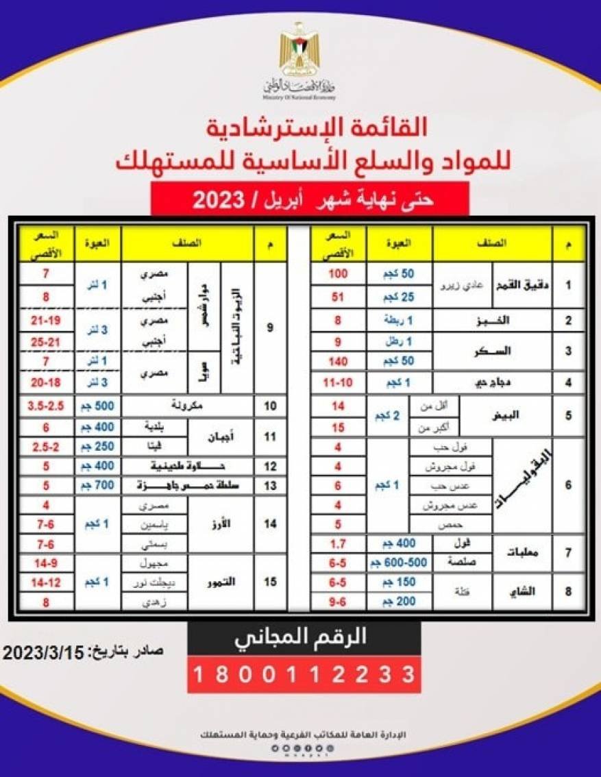 أعلنت وزارة الاقتصاد بغزة، القائمة الاسترشادية للمواد والسلع الأساسية للمستهلك ابتداءً من الأربعاء 15 مارس 2023 م حتى نهاية شهر أبريل 2023 م.