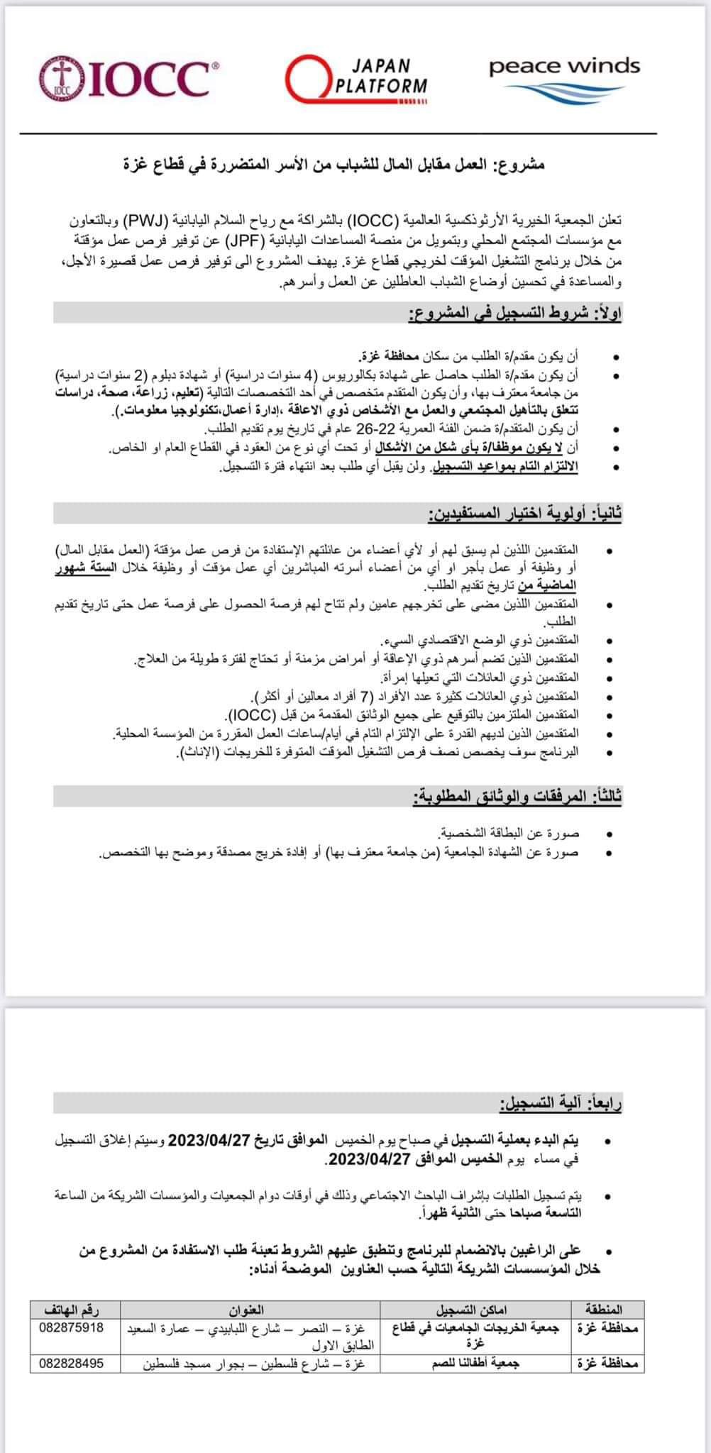 تعلن الجمعية الخيرية الأرثوذكسية العالمية (IOCC) بالشراكة مع رياح السلام اليابانية (PWJ) وبالتعاون مع مؤسسات المجتمع المحلي وبتمويل من منصة المساعدات اليابانية ( JPF ) عن توفير فرص عمل مؤقتة من خلال برنامج التشغيل المؤقت لخريجي قطاع غزة. يهدف المشروع الى توفير فرص عمل قصيرة الأجل، والمساعدة في تحسين أوضاع الشباب العاطلين عن العمل وأسرهم.