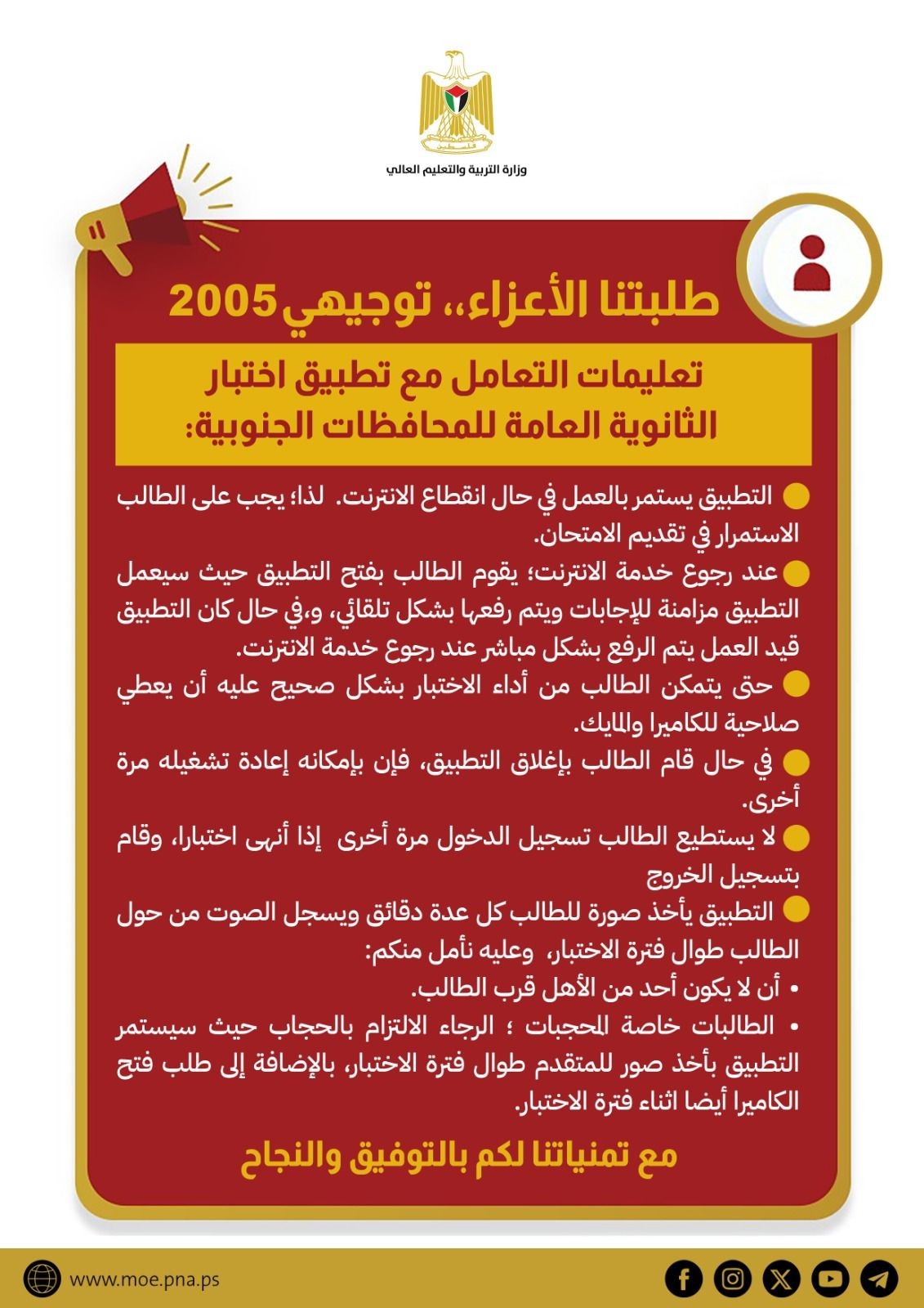 أصدرت وزارة التربية والتعليم العالي الفلسطينية، اليوم الخميس 17 يوليو 2025، حزمة من التعليمات لطلبة امتحان الثانوية العامة في قطاع غزة .
