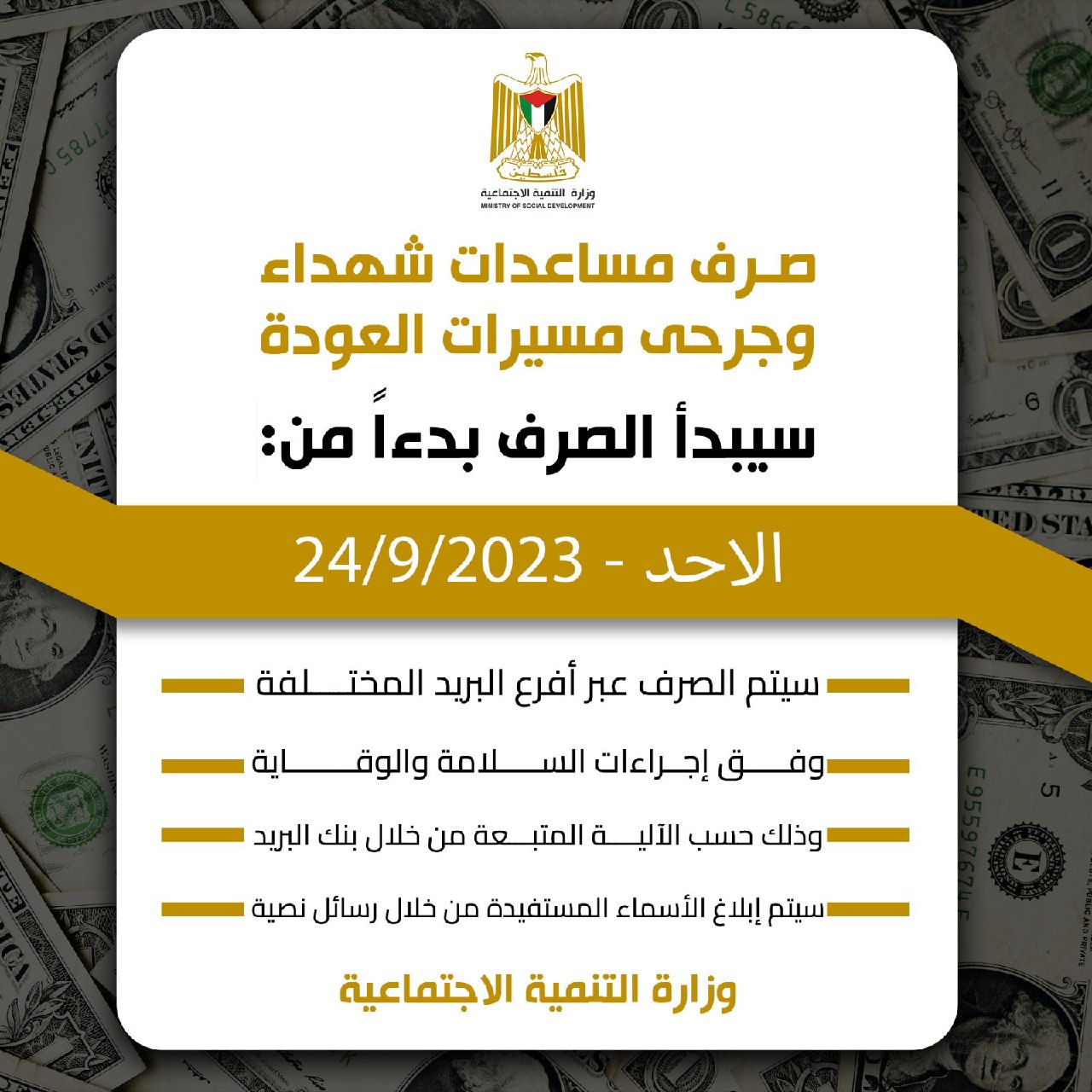 أعلنت وزارة التنمية الاجتماعية في غزة ، اليوم الخميس 21 سبتمبر 2023، عن موعد صرف مساعدات شهداء وجرحى مسيرات العودة.