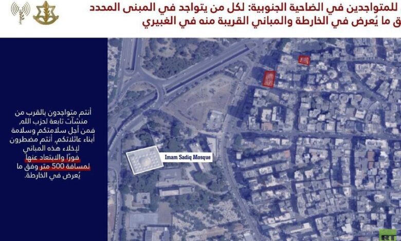 وقال المتحدث باسم الجيش الإسرائيلي للإعلام العربي أفيخاي أدرعي، في بيان: “إلى جميع السكان المتواجدين في منطقة الضاحية الجنوبية وتحديدا في المبنيين المحددين في الخريطة المرفقة وتلك المجاورة لها في الغبيري، أنتم تتواجدون بالقرب من منشآت ومصالح تابعة لحزب الله سوف يعمل ضدها جيش الدفاع على المدى الزمني القريب”.
