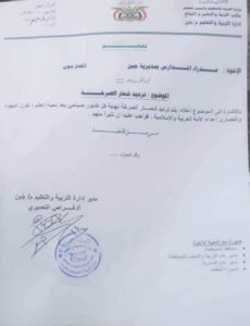 كما أفادت تقارير أخرى بأن الحوثيين فرضوا على المدارس في محافظة الضالع ترديد “الصرخة الخمينية” بدلاً من النشيد الوطني أثناء الطابور الصباحي، مما أثار موجة من الغضب والاستنكار بين الطلاب وأولياء الأمور.
