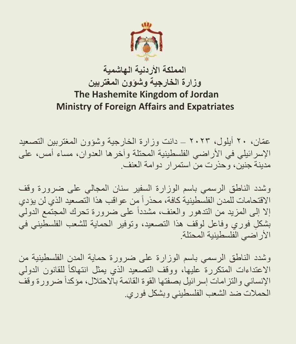 عقبت وزارة الخارجية الأردنية، اليوم الأربعاء 20 سبتمبر 2023، على التصعيد الإسرائيلي في الأراضي الفلسطينية المحتلة وآخرها العدوان مساء أمس، على مدينة جنين، محذرةً من استمرار دوامة العنف.