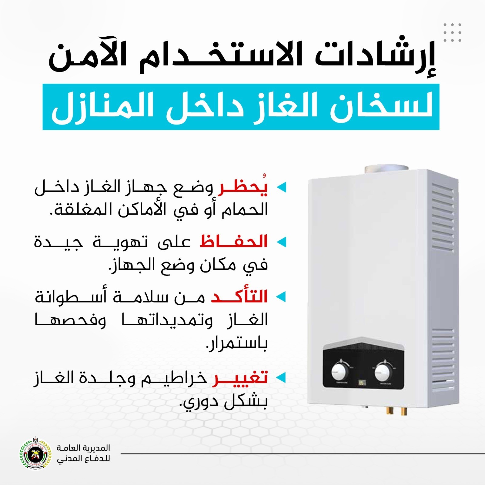 أصدر جهاز الدفاع المدني إرشادات للاستخدام الآمن لسخان الغاز داخل المنازل، وذلك عقب تكرار حدوث وفيات على إثر استخدامه بشكل خاطئ.