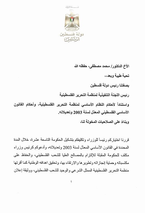 كلّف الرئيس الفلسطيني محمود عباس ، مساء يوم الخميس، الدكتور محمد مصطفى بتشكيل الحكومة الـ 19، وذلك خلال المدة المحددة في القانون الأساسي المعدل لسنة 2003 وتعديلاته.