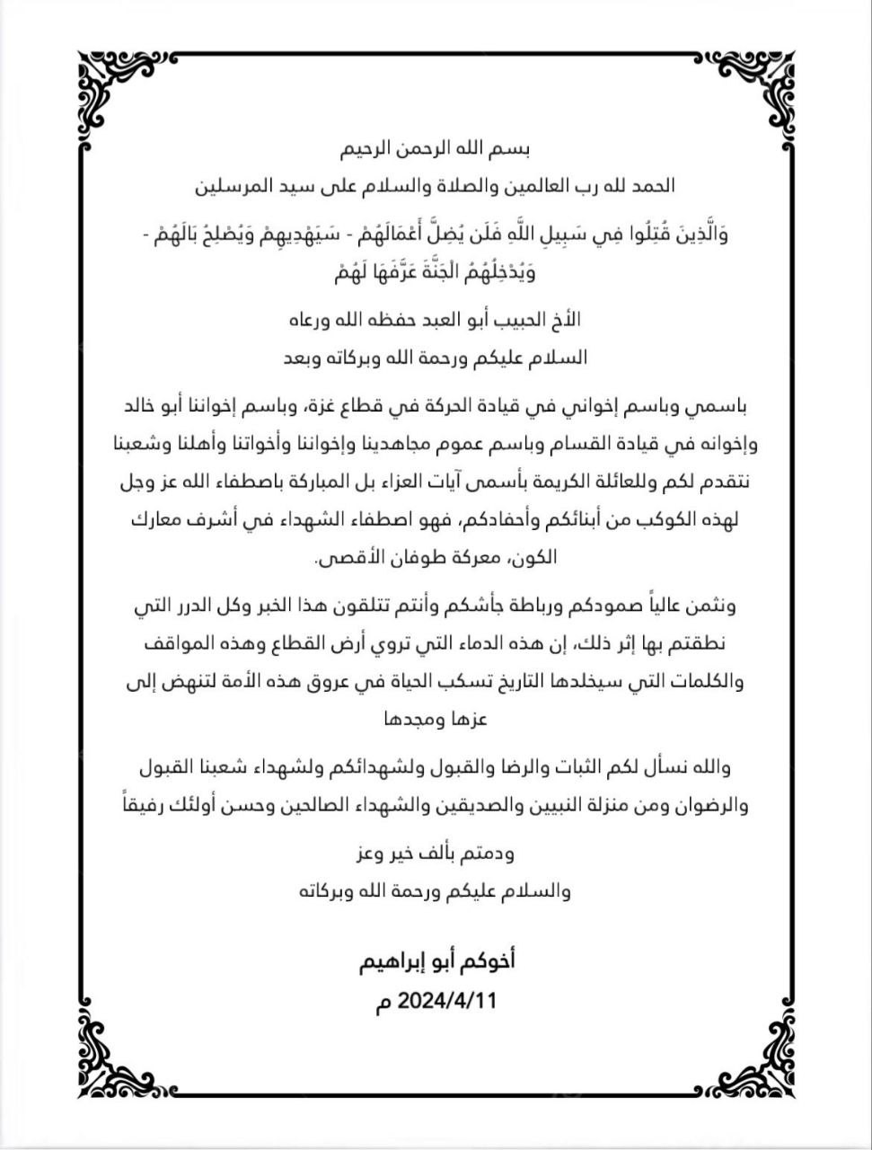 وقال السنوار في الرسالة -التي نشرتها قناة الأقصى-: “أتقدم لكم وللعائلة الكريمة بأسمى آيات العزاء بل المباركة باصطفاء الله عز وجل لهذه الكوكبة من أبنائكم وأحفادكم فهو اصطفاء الشهداء في أشرف معارك الكون، معركة طوفان الأقصى”.