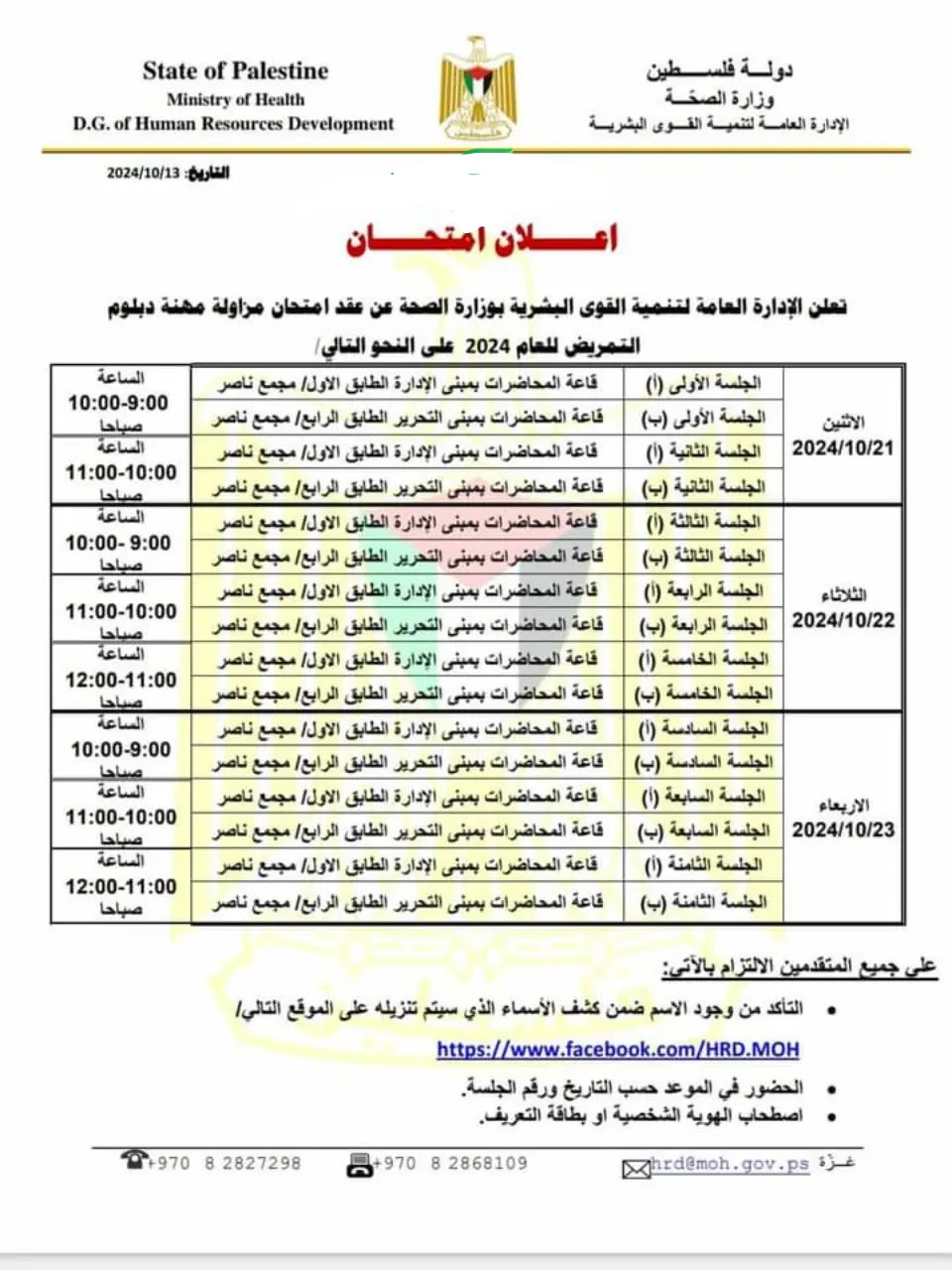 أعلنت وزارة الصحة في دولة فلسطين، ممثلة بالإدارة العامة لتنمية القوى البشرية، عن جدول امتحانات مزاولة مهنة دبلوم التمريض للعام 2024.