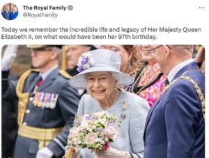 كما انتقل عشاق العائلة المالكة إلى تويتر لمشاركة أمنياتهم الطيبة والتذكير بإرث الملكة، قال أحدهم: “أتذكر الملكة الراحلة إليزابيث الثانية فى عيد ميلادها السابع والتسعين”، وأضاف أخر: “اليوم، نتذكر حياة وإرث جلالة الملكة إليزابيث الثانية فى عيد ميلادها السابع والتسعين، التزامها الراسخ بالواجب والخدمة والبلد سوف يلهم إلى الأبد ويتذكره الأجيال القادمة”.