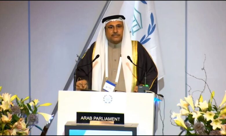 جاء ذلك خلال الكلمة التي ألقاها رئيس البرلمان العربي أمام الجمعية العامة للاتحاد البرلماني الدولي، التي تعقد اجتماعاتها في جنيف خلال الفترة من 23 إلى 27 مارس الجاري، والتي تخصص موضوعها الرئيسي لهذه الدورة حول “دور الدبلوماسية البرلمانية في بناء جسور السلام”.