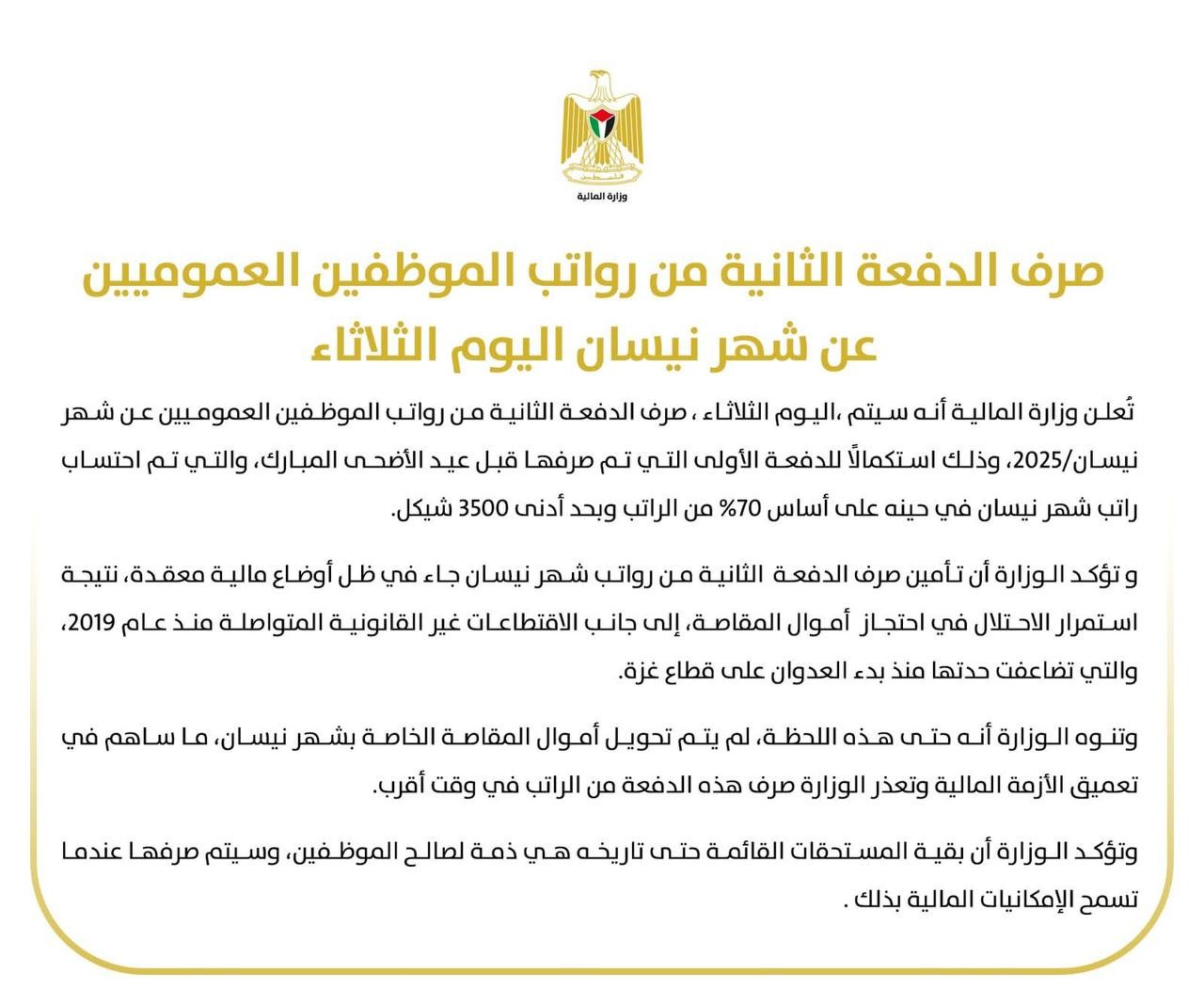 أعلنت وزارة المالية الفلسطينية، أنه سيتم اليوم الثلاثاء 1 يوليو 2025، صرف الدفعة الثانية من رواتب الموظفين العموميين عن شهر نيسان/2025، وذلك استكمالًا للدفعة الأولى التي تم صرفها قبل عيد الأضحى المبارك، والتي تم احتساب راتب شهر نيسان في حينه على أساس 70% من الراتب وبحد أدنى 3500 شيكل.