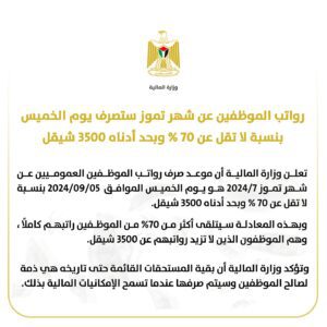تعلن وزارة المالية أن موعد صرف رواتب الموظفين العموميين عن شهر تموز 7/2024 هو يوم الخميس الموافق 05/09/2024 بنسبة لا تقل عن 70 % وبحد أدناه 3500 شيقل.
