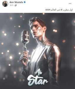 وآخر الاختراعات الفنية التي أعلن مصطفى عنها، عبر “البوست” الذي نشره على صفحته الرسمية على منصة “فيسبوك”، ومفاده أنه يستعد لتقديم أول مطرب عاطفي يغني بالذكاء الاصطناعي، وأنه سيطرح أولى الأغاني بصوته قريباً. فكتب مصطفى على “البوست”: “أول مطرب AI في العالم.. Soon”.