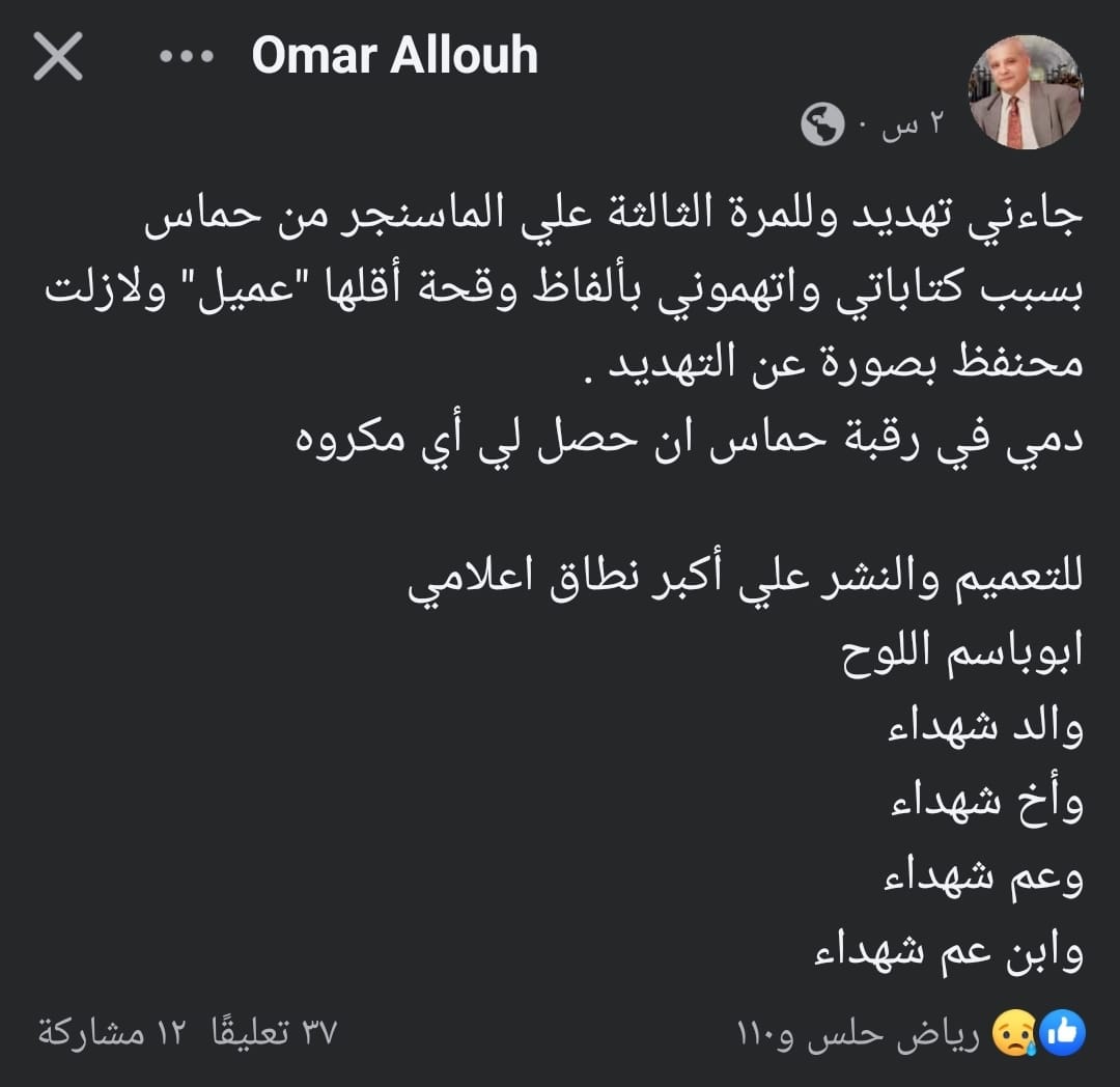 نشر المواطن عمر اللوح عبر صفحته الشخصية على فيسبوك أنه تلقى تهديدًا للمرة الثالثة عبر تطبيق “ماسنجر” من جهات قال إنها تنتمي إلى حركة حماس، على خلفية آرائه وكتاباته.