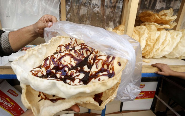 – بعد أن تجف أطراف العجين، تتم إزالته من المقلاة، ووضعه على منديل جاف.