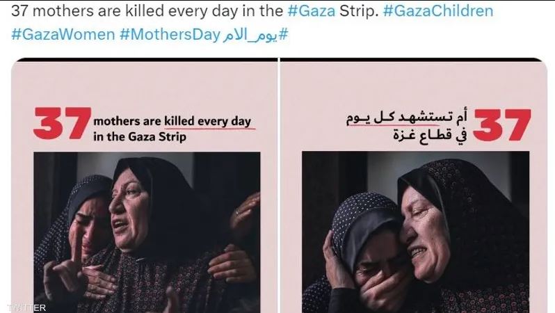 وقالت الجمعية في تغريدتها التي أرفقتها بصورة أم فلسطينية: “37 أمّا يستشهدن كل يوم في قطاع غزة”.