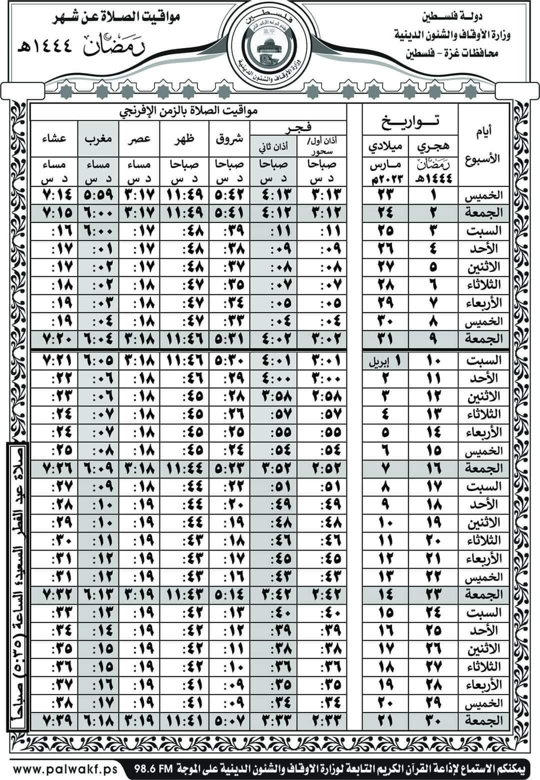 أعلنت وزارة الأوقاف والشؤون الدينية في فلسطين، اليوم الثلاثاء 21 مارس 2023، عن مواقيت الصلاة عن شهر رمضان المبارك 1444هـ.