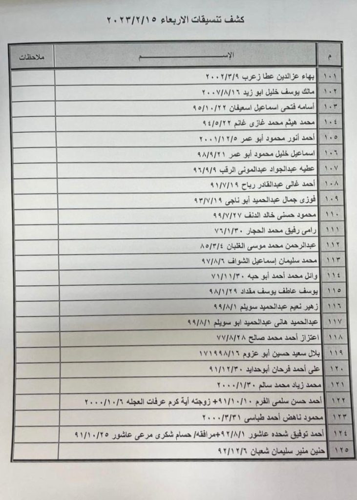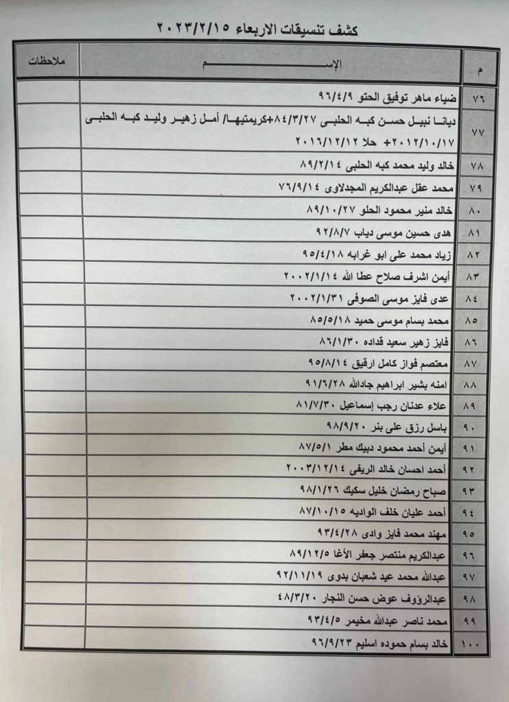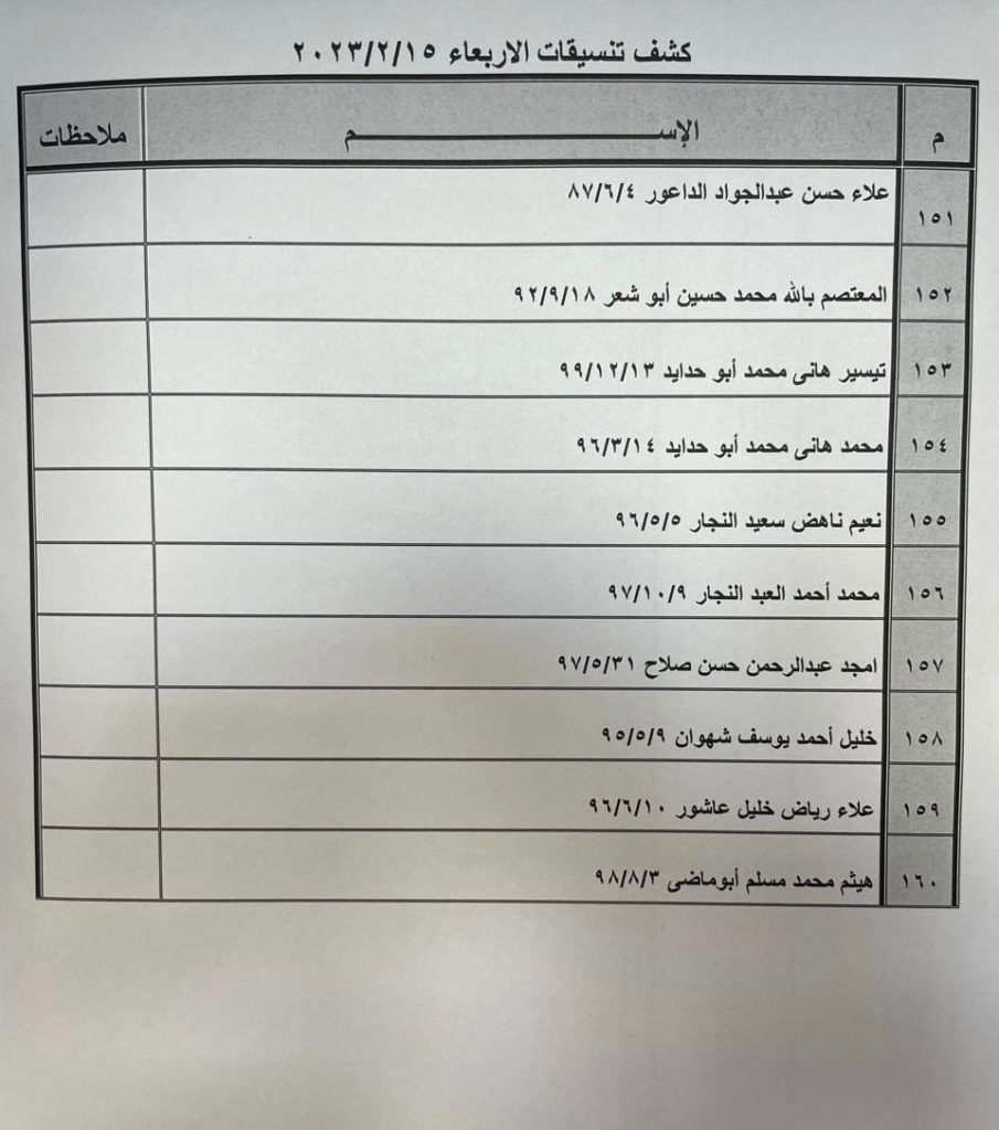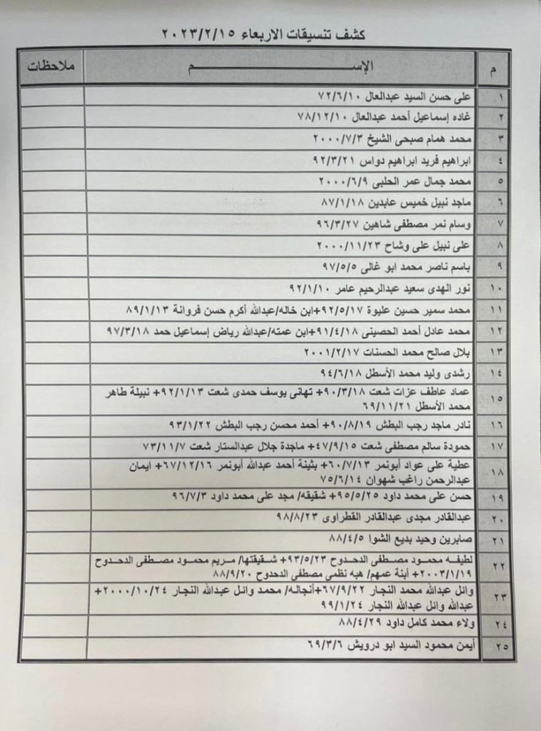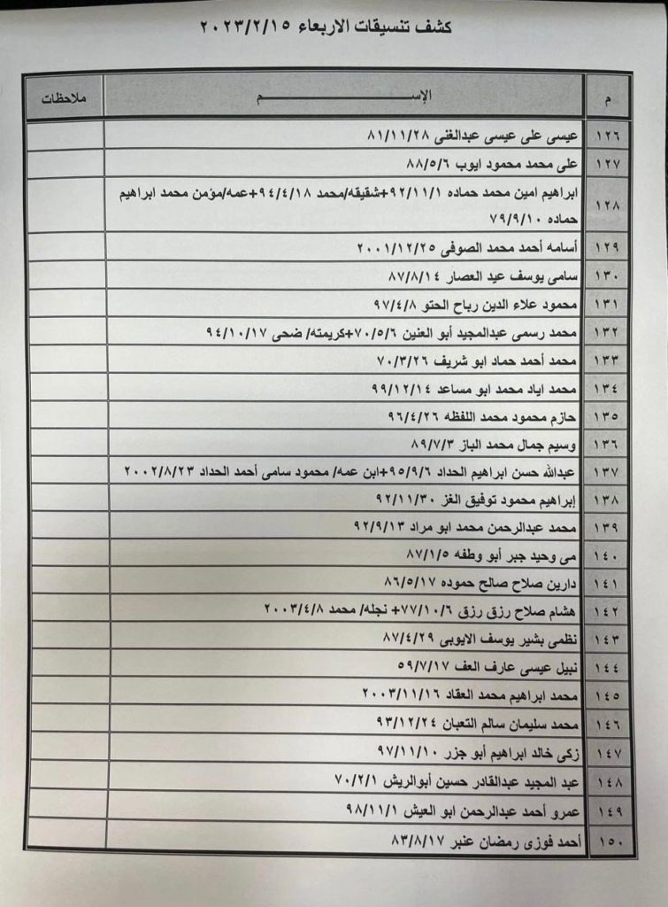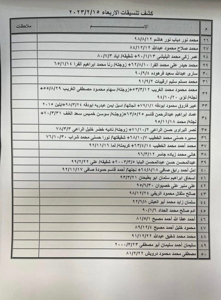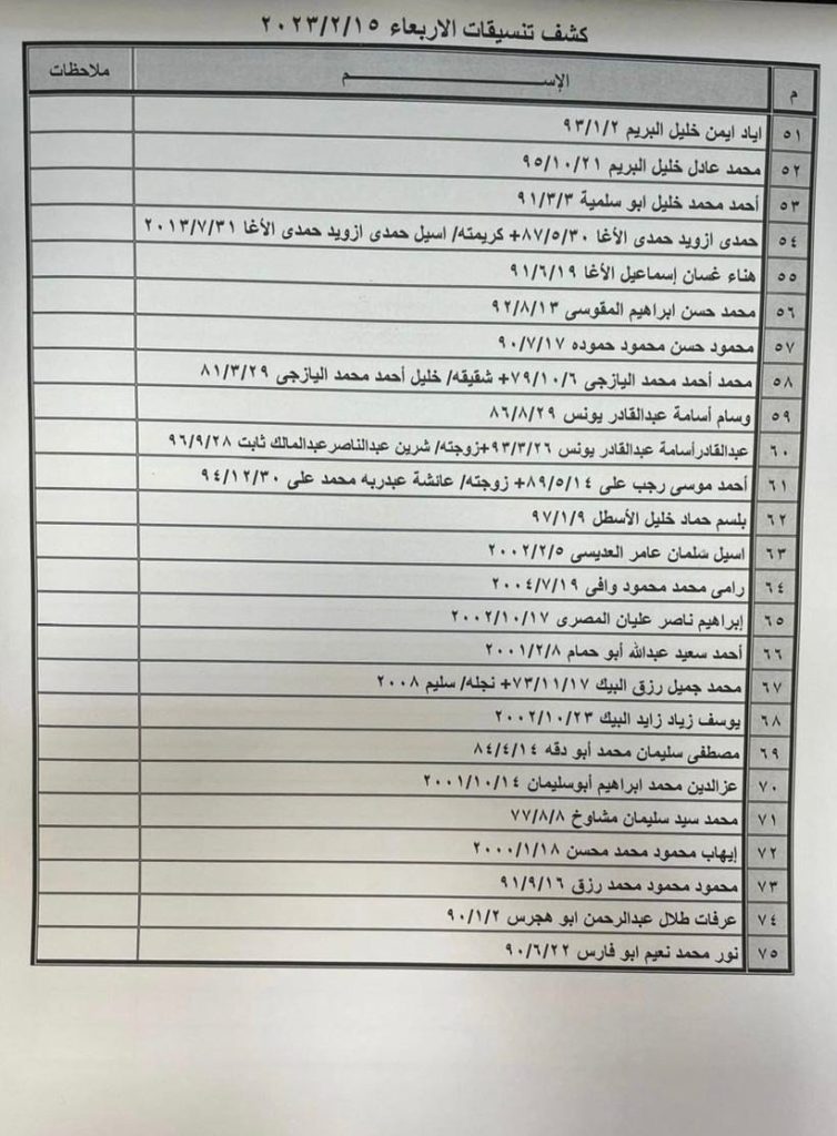 ودعت الهيئة الأسماء الواردة في كشف التنسيقات المصرية ليوم الأربعاء 15 فبراير التواجد الساعة السابعة صباحا في الصالة الخارجية لمعبر رفح لتسهيل سفرهم.