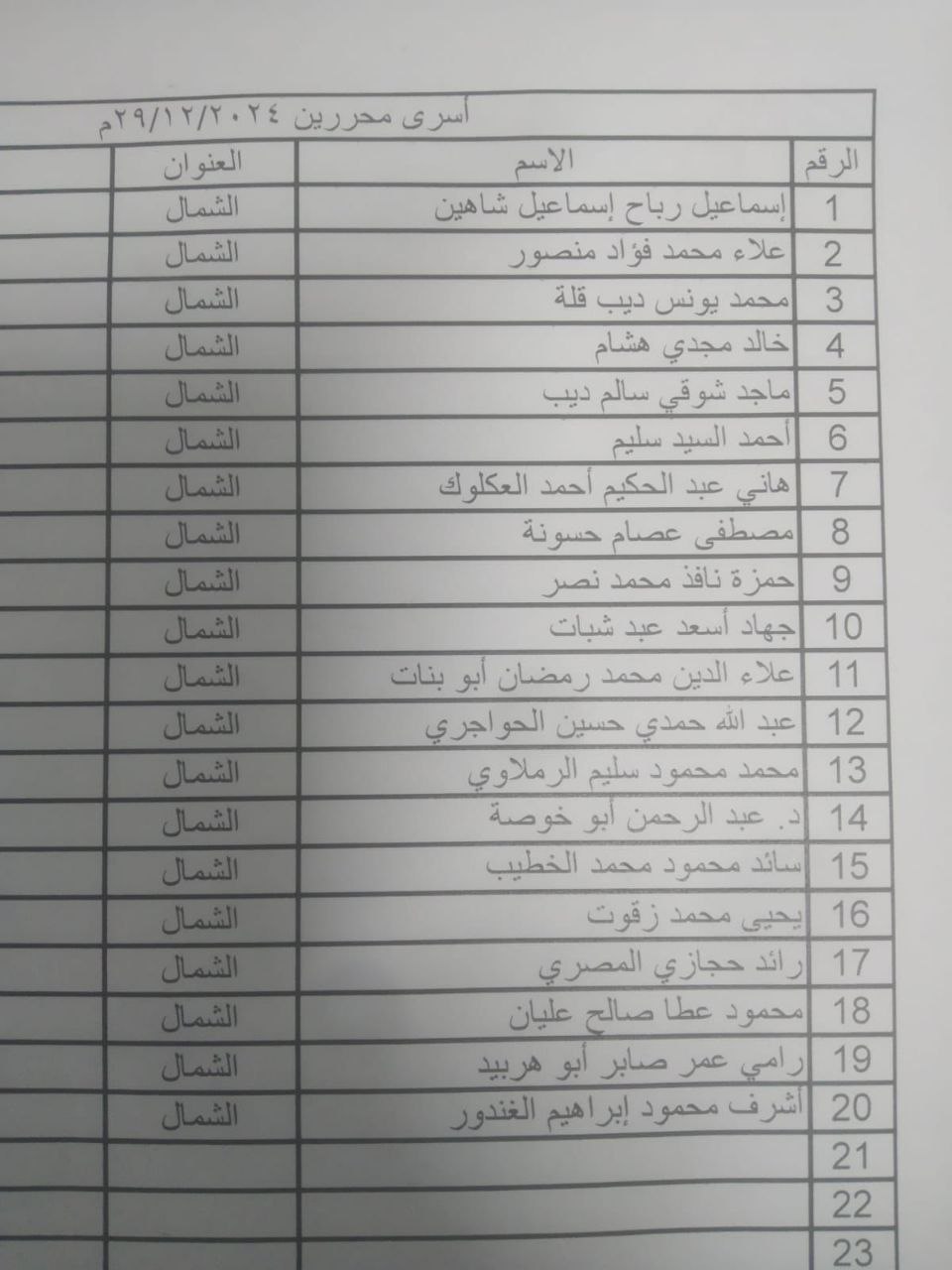 أفرجت سلطات الاحتلال الإسرائيلي، صباح اليوم الأحد 29 ديسمبر 2024، عن 20 أسيراً من قطاع غزة ، عقب اعتقالهم لعدة أشهر وأسابيع، خلال عمليات التوغل والاجتياح البري للقطاع.