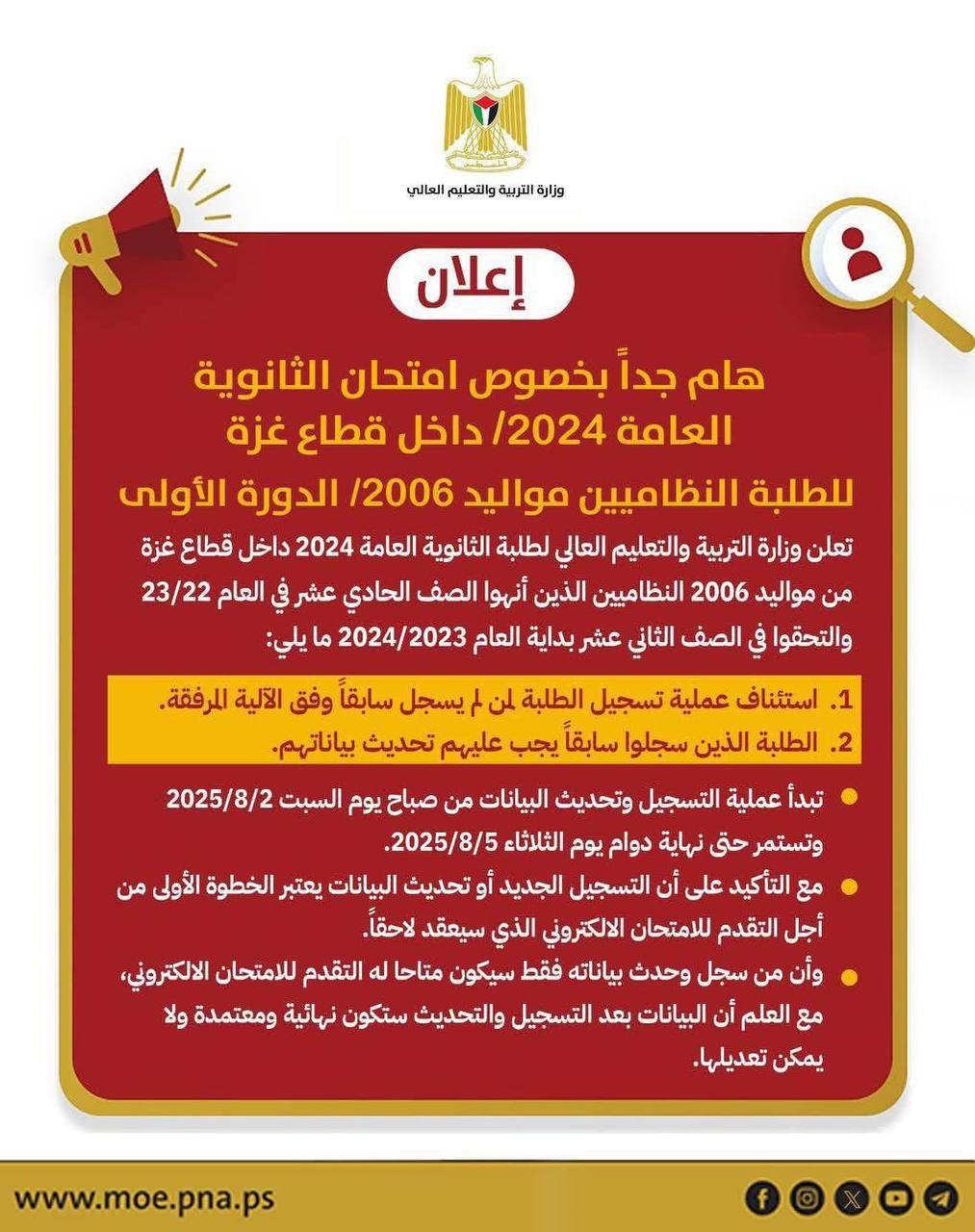 وأكدت الوزارة أن التسجيل وتحديث البيانات سيبدأ صباح يوم السبت الموافق 2 أغسطس 2025، ويستمر حتى نهاية دوام يوم الثلاثاء 5 أغسطس 2025، مشددة على أن هذه الخطوة تُعد شرطًا أساسيًا للتقدّم لامتحانات الثانوية العامة.