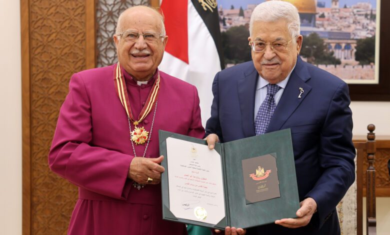 قلد رئيس دولة فلسطين محمود عباس، المطران رياح حنا أبو العسل، الاسقف الثالث عشر للكنيسة الأنجليكانية الأسقفية في القدس والشرق الأوسط، نجمة القدس من وسام القدس.