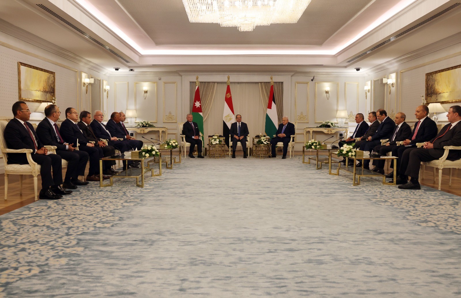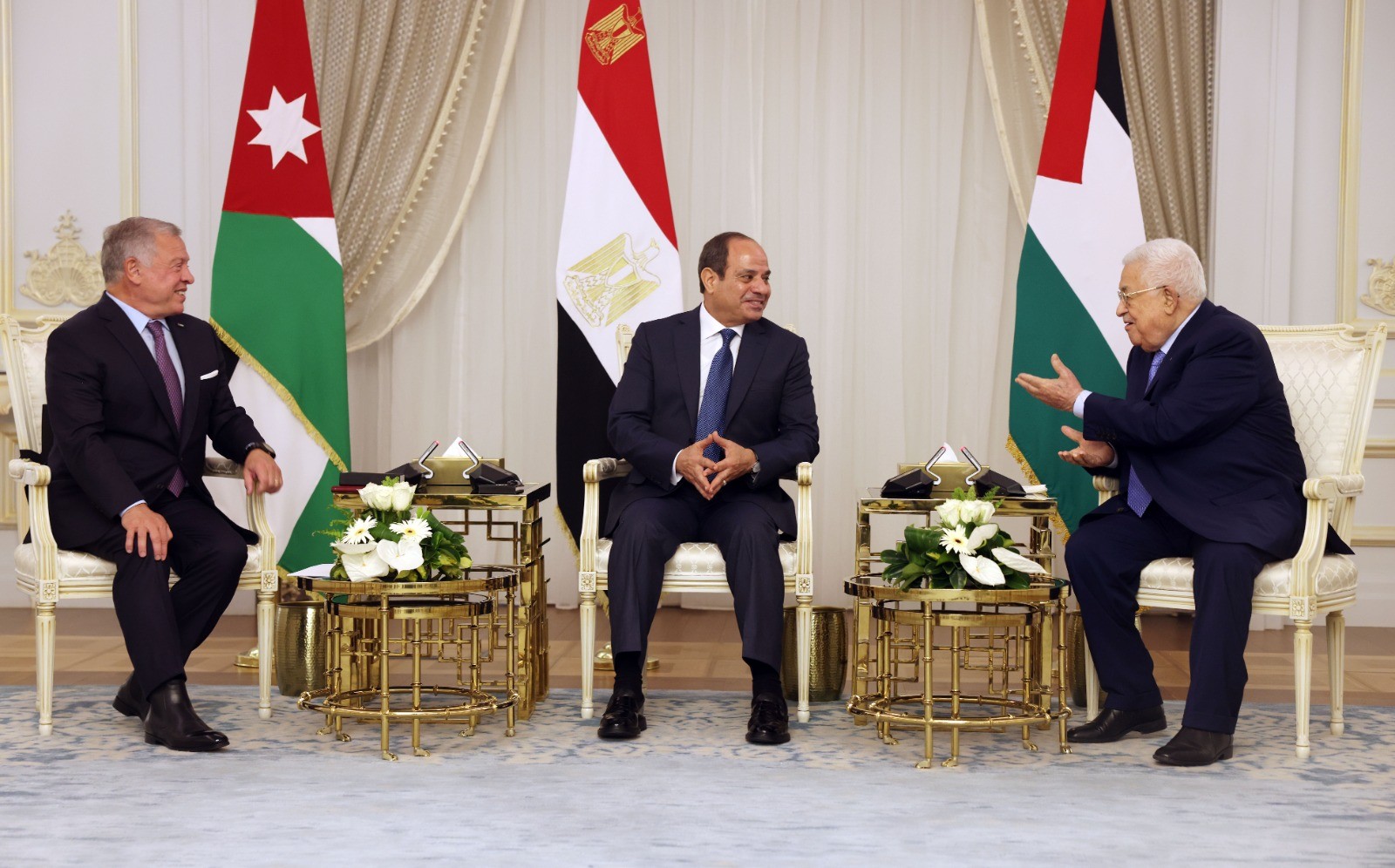 1. استضاف فخامة الرئيس عبد الفتاح السيسي رئيس جمهورية مصر العربية في قمة ثلاثية، صاحب الجلالة الهاشمية الملك عبد الله الثاني ابن الحسين ملك المملكة الأردنية الهاشمية، وفخامة الرئيس محمود عباس رئيس دولة فلسطين، في العلمين يوم ١٤ أغسطس/ آب ۲۰۲۳، وذلك لبحث تطورات القضية الفلسطينية في ضوء المستجدات الراهنة في أرض دولة فلسطين المحتلة، والأوضاع الإقليمية والدولية المرتبطة بها.