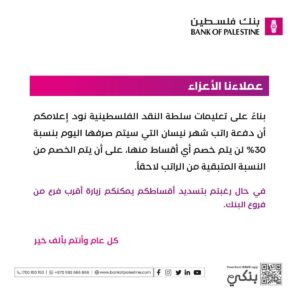 وأشار بنك فلسطين، إلى أن هذا القرار يأتي بناءً على تعليمات من سلطة النقد الفلسطينية.