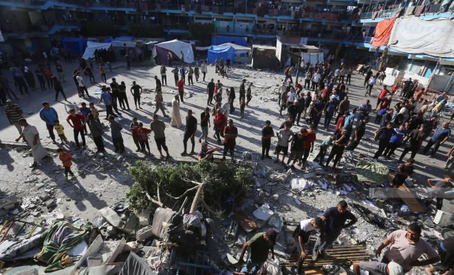 وأفادت مصادر طبية بارتقاء 28 شهيدًا جراء قصف الاحتلال لمدرسة أبو حسين التي تؤوي نازحين في جباليا شمال قطاع غزة.