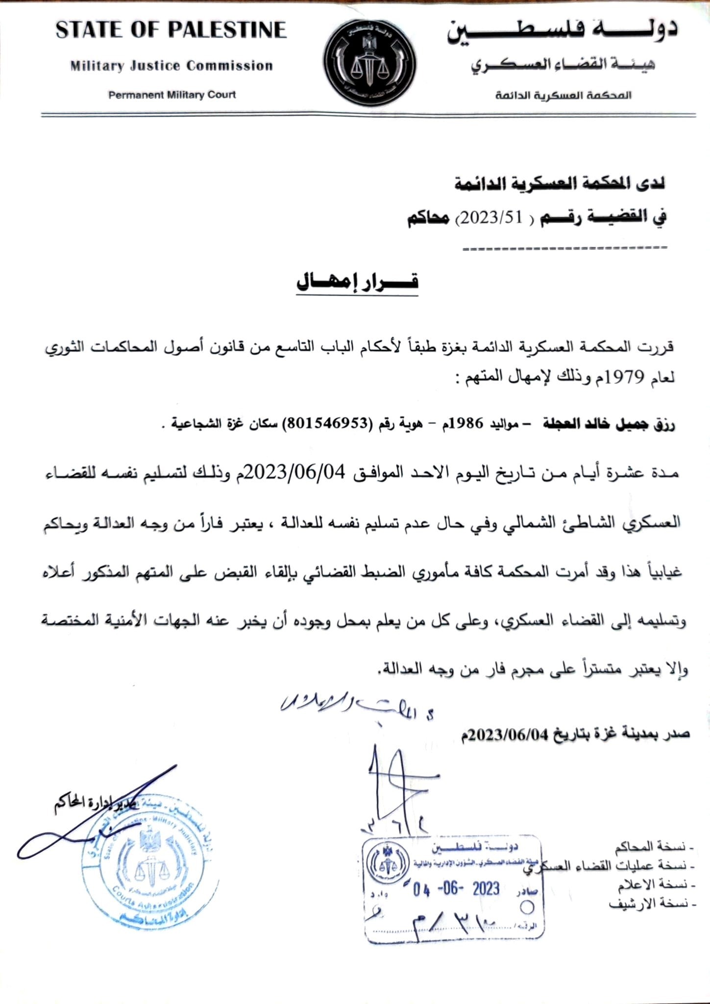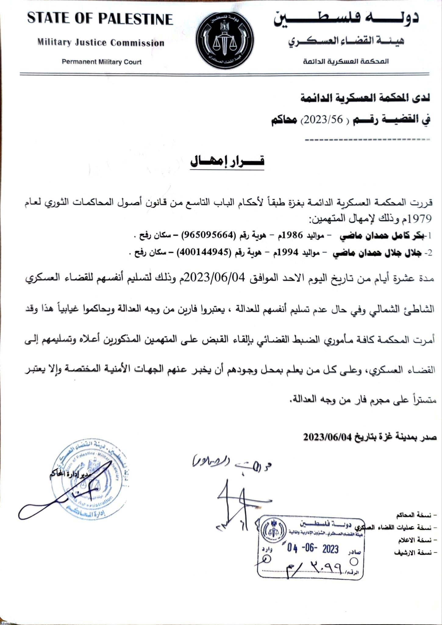 أمهلت المحكمة العسكرية الدائمة – التابعة لهيئة القضاء العسكري بغزة، ثلاثة متهمين هم: بكر كامل حمدان ماضي، هوية رقم (965095664)، سكان رفح، جلال جلال حمدان ماضي، هوية رقم (400144945)، سكان رفح، رزق جميل خالد العجلة، هوية رقم (801546953) سكان غزة-الشجاعية عشرة أيام من تاريخ الأحد الموافق 04/06/2023م لتسليم أنفسهم للقضاء العسكري.